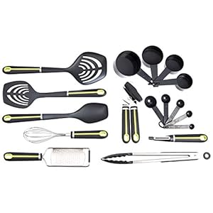 • Amazon Basics – Set de 17 utensilios de cocina con mango suave, de color verde y gris