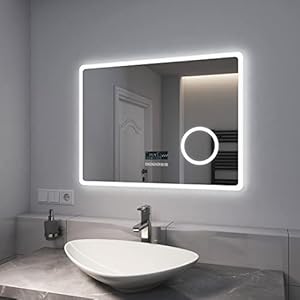 • EMKE Espejo de Baño LED 80 x 60 cm, con Interruptor Tactil + Antivaho + Bluetooth + Reloj + Lupa 3 Veces + Luz Blanca Fria 6500K Espejo Baño Espejo de Pared (Topi L)