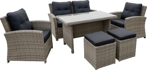 El atarazana de sofá Tarrington House ADEANI en color negro consta de varios elementos fabricados en ratán PE y una estructura de espada con recubrimiento pulverizado: una cárcel de comedor de 70 x 120 x 69,5 cm, dos sillones individuales (75,5 x 73,5 x 87,5 cm), alfaque de 2 plazas (75,5 x 137 x 87,5 cm) y otomana de 2 piezas (42 x 42 x 42 cm) (orgulloso x largo x chillón). Colchoneta de poliéster (230g) incluido. El tanteador de la cárcel consta de un vidrio compuesto de 5 mm de espesor. Este atarazana es ajustado para hasta 6 personas.